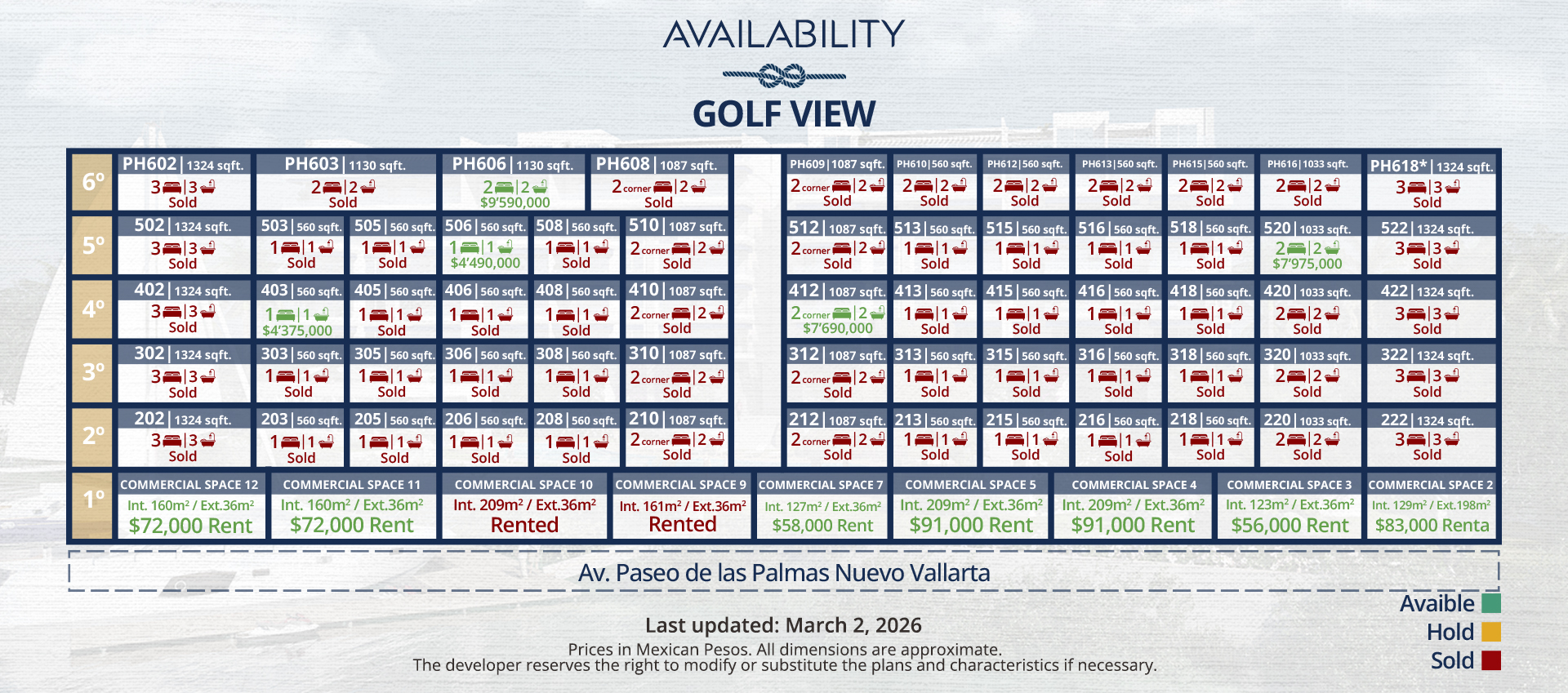 With its prime location and stunning architectural design, these residences boast breathtaking views of the adjacent golf course and the iconic Nuevo Vallarta navigation canal. Experience the perfect blend of sophistication and natural beauty in a setting that redefines upscale living.