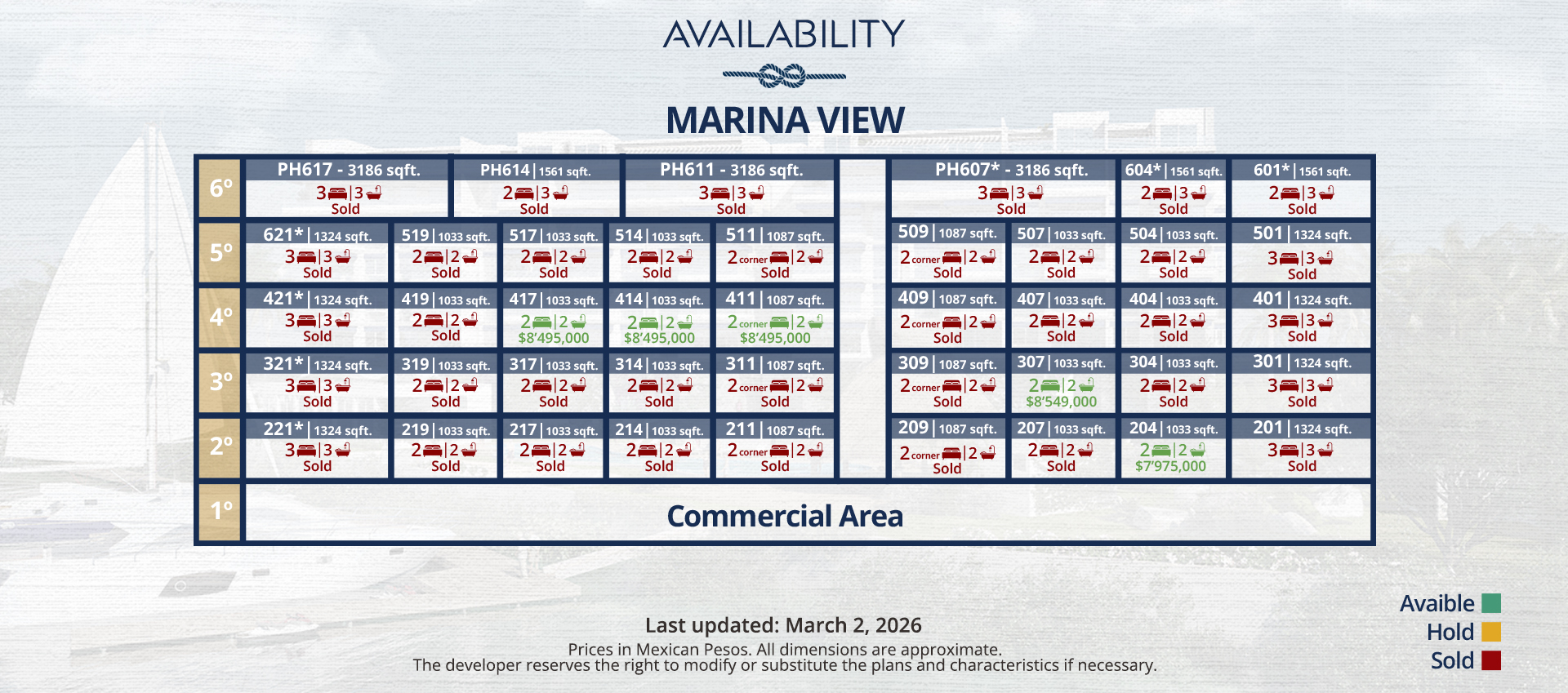 Luxurious condos with wide indoor and terraced spaces, great views of the golf course and spectacular Marina front locations.*